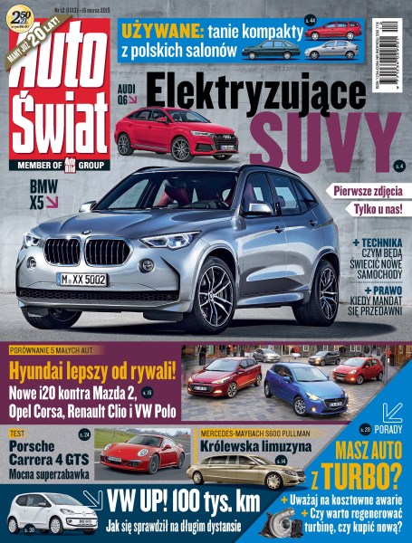 SUV-y BMW i Audi – kolejna generacja X5 i całkiem nowe Q6; Cee’d GT Line, Picanto po face liftingu i zapowiedź drugiej generacji Optimy; Honda HR-V kontra Mazda CX-3 – pierwsze porównanie japońskich crossoverów; Mercedes-Maybach S600 Pullman – superluksusowa limuzyna dla VIP-ów; Hyundai i20, Mazda 2, Opel Corsa, Renault Clio i VW Polo – porównanie małych aut z silnikami benzynowymi; Porsche Carrera 4 GTS – niemiecki sportowiec z superosiągami testowany na polskich drogach.