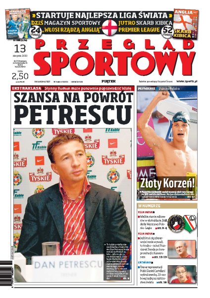 Dan Petrescu może znowu zostać trenerem Wisły Kraków; rozmowa z Józefem Wojciechowskim, właścicielem warszawskiej Polonii przed meczem z Legią; polska reprezentacja piłkarska spadła na samo dno, już gorzej być nie może; wywiad z Łukaszem Fabiańskim, bramkarzem reprezentacji; Paweł Korzeniowski po raz trzeci z rzędu zdobył tytuł mistrza Europy; kłopoty rodzinne nie wpływają negatywnie na formę Tomasza Golloba.