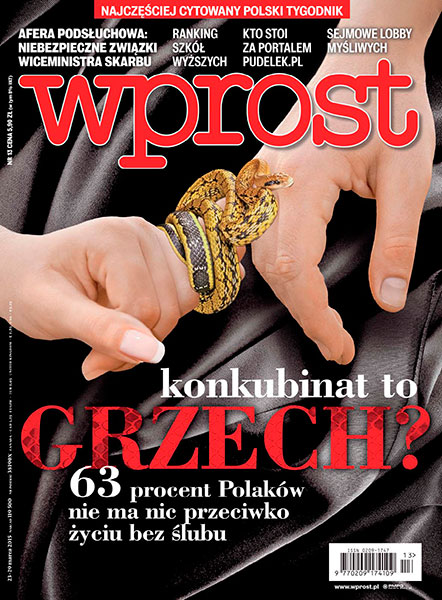 Coraz więcej Polaków żyje bez ślubu - zrasta społeczna akceptacja konkubinatów; kulisy afery taśmowej - jak zdobywano zaufanie polityków; awantury o polityczne pieniądze - rozliczenia w PiS; tunezyjscy dżihadyści zasilający szeregi Państwa Islamskiego wracają do ojczyzny; zbiorowe samobójstwa nastolatków; gluten nie taki zły, jak nas straszono; Pudelek zaczyna umoralniać czytelników.