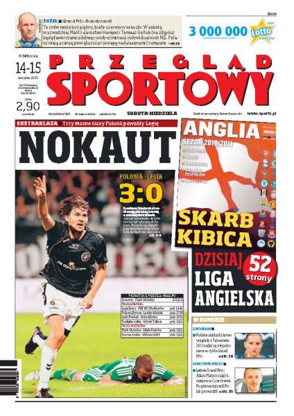 Polonia Warszawa bez większych problemów pokonała w 51. derbach stolicy Legię 3:0; Śląsk Wrocław wygrał z Cracovią 3:2; wywiad z Vukiem Sotiroviciem; poważne kłopoty kadrowe Wisły Kraków; kolejny fantastyczny występ polskich siatkarek, teraz czas na Japonię i Niemcy; w żużlowym Grand Prix Skandynawii wszyscy liczą na dobry występ Tomasza Golloba; Adam Małysz zajął 4. miejsce w drugim letnim konkursie w skokach narciarskich.