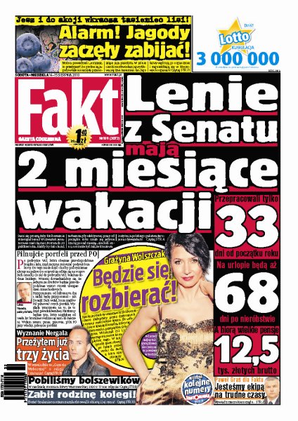 Rozmowa z Pawłem Grasiem na temat afery związanej z krzyżem sprzed Pałacu Prezydenckiego; polscy senatorowie biją rekordy lenistwa; Bronisław Komorowski pracuje już w pałacu; urzędnicy NFZ wydają 300 tys. zł na auta dla siebie; wspomnienie wielkiej Bitwy Warszawskiej z 1920 roku; jagody z polskich lasów są zagrożeniem dla ludzkiego życia; szokujący wywiad z Nergalem; Polonia Warszawa zmiażdżyła Legię 3:0.