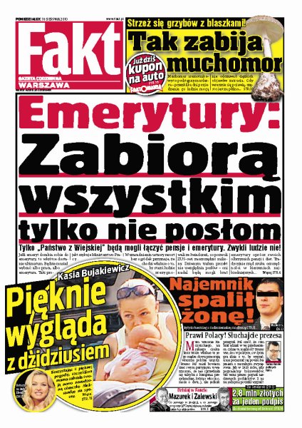 Według ekspertów PO jest o wiele silniejsza niż PiS i SLD, gdy rządziły, ponieważ popierają ją media i elity; minister pracy chce zmienić prawo dotyczące emerytur tylko dla zwykłych obywateli, świadczenia dla polityków zostaną bez zmian; przybywa krzyży pod Pałacem Prezydenckim; nawet prezydent RP Bronisław Komorowski ma problemy z upałami; krwawa zemsta żołnierza Legii Cudzoziemskiej; zdjęcia Kasi Bujakiewicz z dzidziusiem.