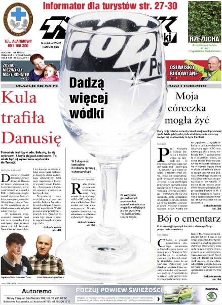 Kula trafiła Danusię – terrorysta trafił ją w ud. Bała się, że się wykrwawi, ukryła się pod autobusem, to miała być jej wymarzona wycieczka do Tunezji; w Zakopanem koncesjami na alkohol spłacają wyborczy dług; kiedy dziecko umierało, lekarka najprawdopodobniej spała – może gdyby odczytała właściwie zapis aparatury medycznej, uratowałoby to życie Karolinki; kontrowersyjny pomysł burmistrza Nowego Targu poszerzenia cmentarza.