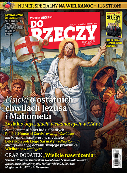 Ostatnie chwile Jezusa i Mahometa; polska Wielkanoc w grafice gazetowej w XIX w.; Piotr Gursztyn rozmawia z Jarosławem Kaczyńskim; PiS potrzebuje Grzegorza Biereckiego, a Bierecki potrzebuje PiS; Dorota Kania o resortowych dynastiach; niedziela bez zakupów; dodatek specjalny: wielkie nawrócenia.