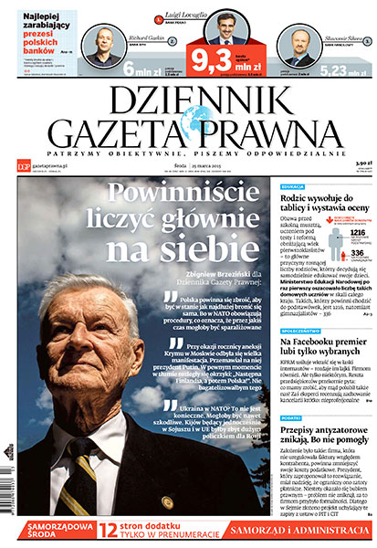 Zbigniew Brzeziński o polityce Rosji i zagrożeniu dla Polski; lista najwięcej zarabiających prezesów banków; coraz więcej rodziców decyduje się na edukację w domu; obowiązkowa korekta kosztów miała być lekiem na zatory płatnicze, ale ich nie zlikwidowała - za to stała się utrudnieniem dla wszystkich firm; eksperci negatywnie o promowaniu przez Kancelarię Prezesa Rady Ministrów niektórych inicjatyw w mediach społecznościowych.