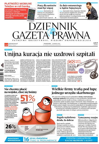 Unijna kuracja nie uzdrowi szpitali; już ponad 3,5 mln Polaków korzysta z różnych rozwiązań umożliwiających obsługę rachunku bankowego przez smartfony; starzejemy się szybciej niż mieszkańcy innych krajów Wspólnoty – alarmuje OECD w najnowszym raporcie; Marszałek Sejmu nie pozostawia wątpliwości: pierwszy prezes SN nie mogła się wyręczać pełnomocnikiem w postępowaniu przed Trybunałem Konstytucyjnym; nie chcemy płacić na wojsko, choć się boimy; wielkie firmy trafią pod lupę jednego urzędu skarbowego; reguła wydatkowa działa za dobrze; skłóceni politycy i oligarchowie obniżyli temperaturę konfliktu o kontrolę nad Ukrainą oraz reguły gry w wielkim biznesie.