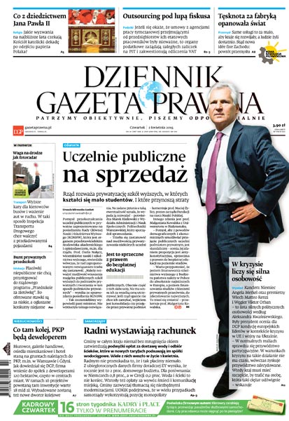 Rząd rozważa prywatyzację szkół wyższych, w których kształci się mało studentów i które przynoszą straty; jakie wyzwania na najbliższe lata czekają Kościół katolicki dekadę po odejściu papieża Polaka; jeżeli się okaże, że umowy z agencjami pracy tymczasowej przejmującymi od przedsiębiorstw ich etatowych pracowników były nieważne, to organy podatkowe zażądają zaległych zaliczek na PIT i zakwestionują odliczenia VAT; same usługi to za mało, aby kraje się rozwijały, a ludzie żyli dostatnio, stąd nowa idée fixe Zachodu: powrót przemysłu; wyższe kary dla kierowców busów i ważenie aut w ruchu – w taki sposób Inspekcja Transportu Drogowego chce walczyć z przeładowanymi pojazdami; PKP będą deweloperem; gminy w całym kraju niemal bez mrugnięcia okiem zatwierdzają podwyżki opłat za dostawę wody i odbiór ścieków, które w nowych taryfach podsuwają im spółki wodociągowe; Aleksander Kwaśniewski ocenia dla DGP kondycję europejskich liderów w kontekście kryzysu w UE i wojny na Ukrainie.
