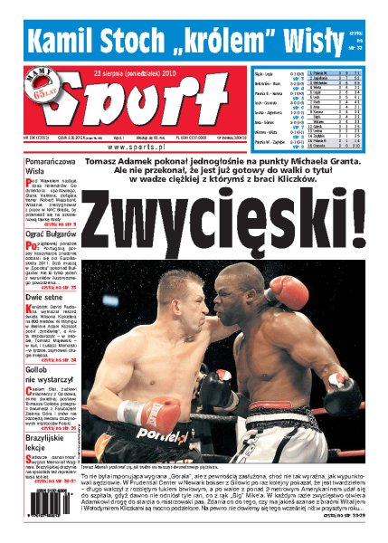 Tomasz Adamek pokonał jednogłośnie na punkty Michaela Granta, jednak według fachowców polski bokser nie udowodnił, że jest już gotów na walkę o mistrzostwo; szczegółowa analiza spotkań 3. kolejki piłkarskiej ekstraklasy; Kamil Stoch zdominował zawody Letniego Grand Prix w Wiśle; zespół Brazylii zajął pierwsze miejsce w Memoriale Wagnera; polscy koszykarze mają nikłe szanse na awans do mistrzostw Europy.