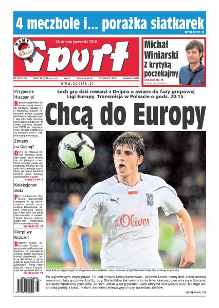 Po wyjazdowym zwycięstwie nad Dnipro 1–0, Lech stanie przed szansą awansu do fazy grupowej Ligi Europy; Sevilla w poprzednim sezonie awansowała do 1/8 finału Ligi Mistrzów zarabiając na tym 24,3 miliona euro, teraz odpadła już w eliminacjach z Brag; prezes PZPN Grzegorz Lato poinformował w środę, że mimo ostatnich porażek reprezentacji Polski na pewno nie zwolni selekcjonera Franciszka Smudy; USA bez Rajona Rondo, a Hiszpania bez Jose Manuela Calderona – faworyci mistrzostw świata w Turcji zagrają bez największych gwiazd; brązowy medal mistrzostw Europy to jeszcze nie jest karta przetargowa na największe mityngi.