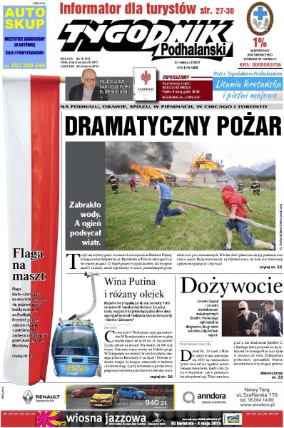 Flaga biało-czerwona na maszcie powinna się pojawić przed każdym domem na Podhalu – zachęca zakopiański poseł Andrzej Gut Mostowy; Rosjanie nie przyjadą już do nas na narty – Putin im zabronił i kazał jechać do Soczi, co prócz braku rosyjskich turystów łączy albo dzieli Bansko i Zakopane; 23-letni Dawid i 22-letni Józef dokonali makabrycznych zbrodni – pierwszego sąd skazał na dożywocie, drugi może wkrótce usłyszeć taki wyrok.; to był największy pożar w ostatnich miesiącach na Podhalu – piękny, kilkupiętrowy budynek na os. Rysulówka w Kościelisku zapalił się we wtorek po godz. 12.