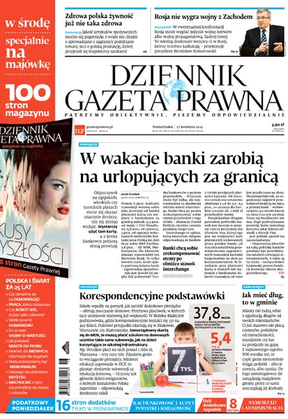 Dziennik Gazeta Prawna – codziennie obiektywne i rzetelne informacje z kraju i ze świata. Piszemy o tym, co dziś ważne i odpowiadamy na Wasze pytania – szczególnie te związane z obecnymi wyzwaniami tj. pandemia, praca zdalna. Na bieżąco wyjaśniamy zmieniające się przepisy. Wspieramy się wyjaśnieniami ministerstw i urzędów. Pomagamy unikać błędów i ostrzegamy, jakie są kary. Ponadto w każdy piątek specjalne magazynowe wydanie Dziennika Gazety Prawnej w całości z tekstami społeczno-ekonomicznymi.