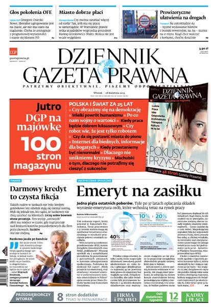 Dziennik Gazeta Prawna – codziennie obiektywne i rzetelne informacje z kraju i ze świata. Piszemy o tym, co dziś ważne i odpowiadamy na Wasze pytania – szczególnie te związane z obecnymi wyzwaniami tj. pandemia, praca zdalna. Na bieżąco wyjaśniamy zmieniające się przepisy. Wspieramy się wyjaśnieniami ministerstw i urzędów. Pomagamy unikać błędów i ostrzegamy, jakie są kary. Ponadto w każdy piątek specjalne magazynowe wydanie Dziennika Gazety Prawnej w całości z tekstami społeczno-ekonomicznymi.