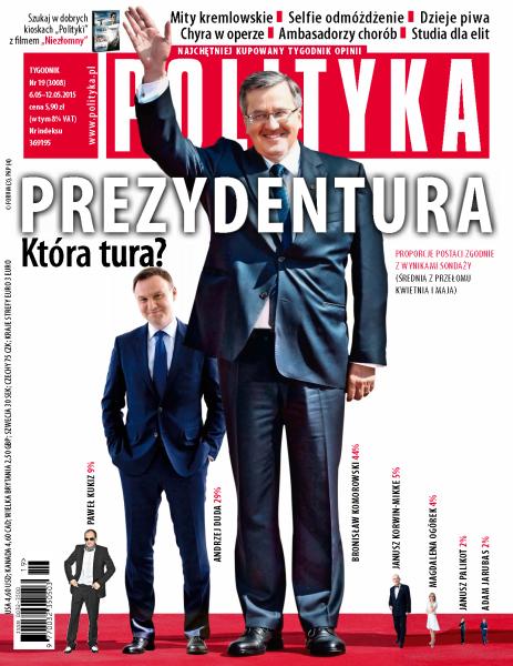 Prezydentura: dziesięciu na jednego; do czego służy prezydent; zwycięstwo nad faszyzmem, sprzed 70 lat, jest wciąż żywe w zbiorowej pamięci Rosjan i stanowi zarazem fundament oficjalnej państwowej doktryny i codziennej propagandowej mitologii; jak wyjść z beznadziejnej sytuacji, w jakiej znalazła się polska nauka; selfie odmóżdżenie: po co ludzie to uwieczniają i bez wahania publikują w sieci; która szkoła lepsza: niepubliczna czy państwowa?; SKOK blisko WSI; moda na wypożyczanie; nadchodzą Szkoci – to może być podsumowanie czwartkowych wyborów na Wyspach; Dania: Margrethe Vestager podniosła rękę na Google; skąd się wzięło piwo; rozmowa z reżyserem Juliano Riberio Salgado o jego ojcu, legendarnym fotoreporterze, Sebastião Salgado; grupa trzymająca pióra: Szczepan Twardoch, Łukasz Orbitowski, Wit Szostak i Jakub Żulczyk.