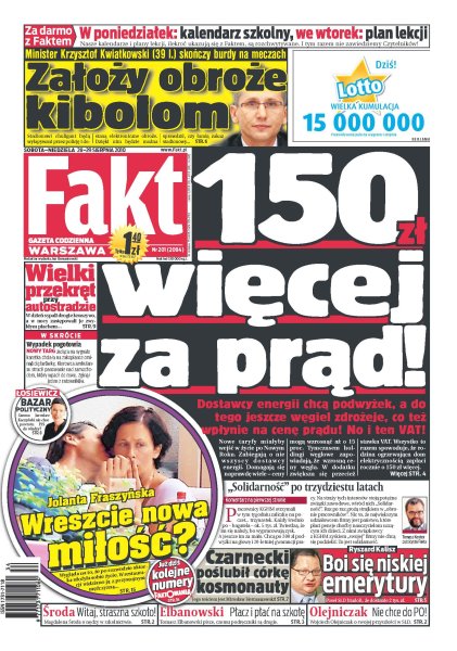 Szykuje się gigantyczna podwyżka cen prądu; Ryszard Kalisz biadoli, że na starość będzie miał niską emeryturę; minister sprawiedliwości wprowadza nowe kary dla pseudokibiców, którzy złamią zakaz stadionowy; europoseł PiS w tajemnicy poślubił Emilię Hermaszewską; na jednym z największych osiedli w Białymstoku nietoperz pogryzł kobietę; Borys Szyc na swoim strychu urządził profesjonalne kino; klub KS Warka bezprawnie zdegradowano do okręgówki; Lech Poznań zagra w grupie Ligi Europejskiej z Juventusem, Manchesterem City i Salzburgiem; dzięki Irkowi Jeleniowi Auxerre zarobi w tym sezonie prawdziwą fortunę.