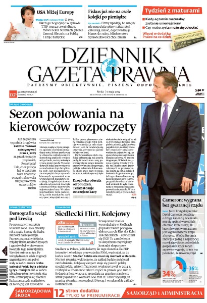 O tym, dlaczego negocjacje w sprawie TTIP muszą trwać długo, mówi Beata Stelmach, prezes General Electric na Polskę i kraje bałtyckie; firmy upadają, bo urzędy nie negocjują spłaty należności - zabierają całość, doprowadzając biznes do ruiny; już za półtora tygodnia drogówka zacznie masowo zatrzymywać prawa jazdy za przekraczanie prędkości; jutro brytyjski premier David Cameron powalczy o drugą kadencję - nie udało mu się spełnić wszystkich obietnic, które złożył, ale jego niewątpliwym atutem jest wyprowadzenie kraju z kryzysu; po notowanym wzroście w latach 2008–2011 czwarty rok z rzędu kurczy się liczba ludności naszego kraju - przyrost naturalny był w pierwszym kwartale tego roku ujemny; szwajcarski Stadler wyprodukuje w Siedlcach 58 pasażerskich pociągów elektrycznych Flirt dla Kolei Holenderskich - to zamówienie to dotychczas największy kontrakt eksportowy Stadlera w Polsce.