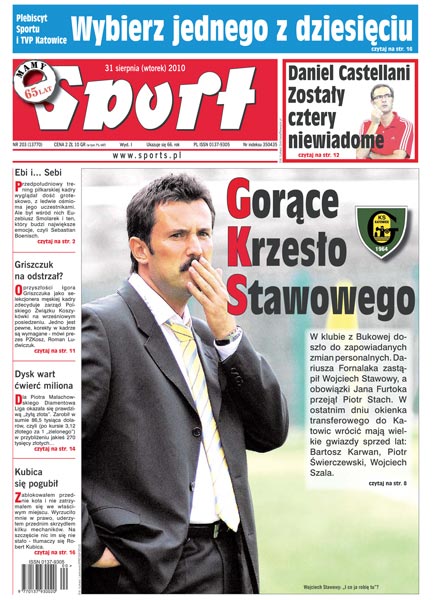 W klubie GKS Katowice doszło do zapowiadanych zmian personalnych; w treningu kadry piłkarskiej wzięli udział Euzebiusz Smolarek i Sebastian Boenisch; o przyszłości Igora Griszczuka na stanowisku selekcjonera męskiej reprezentacji koszykówki zdecyduje zarząd PZKosz.; Diamentowa Liga dobra dla Polaków; Robert Kubica tłumaczył się ze zdarzenia w boksie serwisowym; plebiscyt Sportu i TVP Katowice.