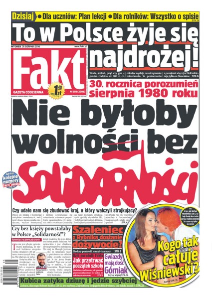 30. rocznica porozumień sierpnia 1980 roku - czy udało nam się zbudować kraj, o który walczyli strajkujący?; czy bez księży powstałaby w Polsce „Solidarność”; premier Tusk po 3 latach urzędowania jest jednym z najbardziej doświadczonych i szanowanych przywódców europejskich; w Polsce żyje się najdrożej w porównaniu z innymi krajami UE; Jerzy Wenderlich wyjechał z przyjaciółką do gorącej Turcji na romantyczne wakacje; sprawca sobotniej masakry w Rybniku nie chce zeznawać; psycholog radzi, jak przygotować dziecko do pójścia do szkoły.