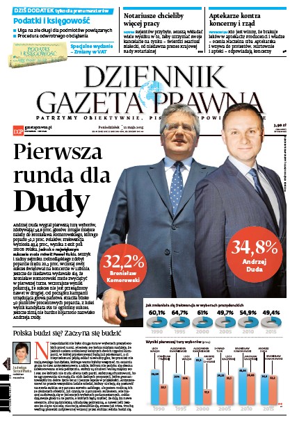 Andrzej Duda wygrał pierwszą turę wyborów; notariusze muszą wkładać wiele wysiłku w to, żeby utrzymać swoje kancelarie na rynku; kto jest winny tego, że brakuje leków w aptekach; urzędy skarbowe w zeszłym roku skuteczniej wykrywały nieprawidłowości dotyczące zwrotów podatku od towarów i usług.