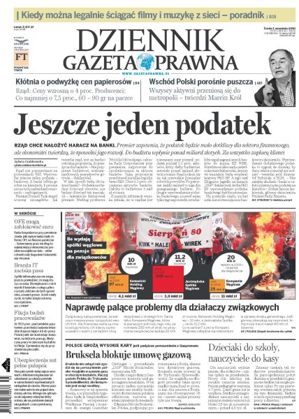 Rząd chce nałożyć haracz na banki – premier zapewnia, że podatek będzie mało dotkliwy dla sektora finansowego, ale ekonomiści twierdzą, że spowolni jego rozwój; przybywa kościelnych rozwodów i firm, które w tym pomagają; w czasie wakacji banki w zasadzie nie zmieniły warunków udzielania kredytów gotówkowych; Kazimierz Herba jest o kilka kroków przed rywalami; jak uzyskać dofinansowanie do wyprawki szkolnej; od dziś do 3 września urzędy kontroli skarbowej i urzędy skarbowe będą sprawdzać punkty oferujące dopalacze; jak dostać unijną dotację na rozpoczęcie własnej działalności gospodarczej.