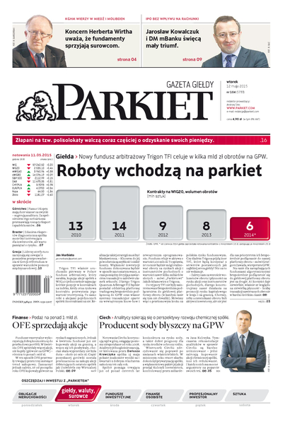 Największy w Polsce newsroom gospodarczy zbiera, analizuje i zgłębia dla Państwa najważniejsze informacje ze świata finansów. Codzienne wydanie „Parkietu”, sześć dni w tygodniu, to kilkadziesiąt artykułów o emitentach, instytucjach finansowych, gospodarce. To również opinie, felietony i wywiady z najważniejszymi ludźmi krajowej i globalnej finansjery.