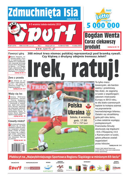 Mecz z Ukrainą, pomimo tego, że jest tylko spotkaniem towarzyskim, daje szansę naszej reprezentacji na poprawienie beznadziejnego bilansu ostatniego półrocza; przyjście Mariusza Ujka wprowadziło wiele „twórczego fermentu” w Polonii Bytom; PGE GKS Bełchatów zostało nieformalną drużyną miesiąca; Piast Gliwice nadal niepokonany w lidze; debiut nowego trenera GKS Katowice; Agnieszka Radwańska po raz drugi z rządu pożegnała się w drugiej rundzie z kortami w Nowym Jorku; rozmowa z Rafałem Jackiewiczem, który w sobotę będzie walczył o tytuł mistrza świata IBF w wadze półśredniej.