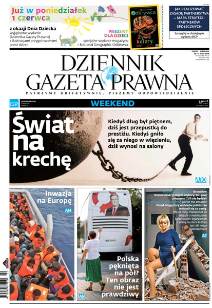 Świat na krechę: kiedyś dług był piętnem, dziś jest przepustką do prestiżu, kiedyś gniło się za niego w więzieniu, dziś wynosi na salony; Polska pęknięta na pół – ten obraz nie jest prawdziwy; inwazja na Europę: liczba nielegalnych imigrantów, którzy w ubiegłym roku próbowali utorować sobie drogę na terytorium UE, jest dwa razy wyższa niż rok wcześniej, trend zapewne utrzyma się i w tym roku; rozmowa z Agnieszką Odorowicz, szefową Polskiego Instytutu Sztuki Filmowej; wybór Andrzeja Dudy na prezydenta to największa zmiana polityczna od 1995 r., kiedy Lech Wałęsa przegrał z wychowankiem PZPR; w latach 90. mały handel tworzyli sprzedawcy z metalowych szczęk oraz polowych łóżek, za to dziś masowy rynek gastronomiczny budują setki food trucków.