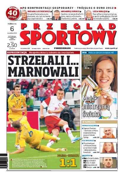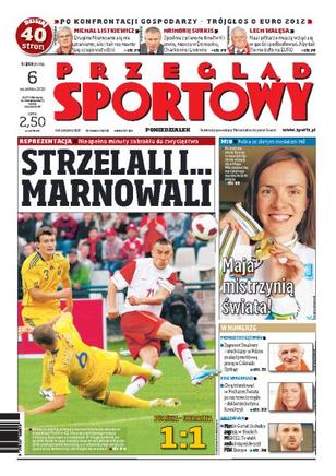 Polscy piłkarze strzelili wreszcie bramkę, ale nie udało im się pokonać Ukrainy, z którą zremisowali 1:1; wywiad z Ireneuszem Jeleniem; ocena gry poszczególnych reprezentantów Polski; zawodnicy Śląska Wrocław stają murem za swoim trenerem; Maja Włoszczowska na trudnej i mokrej trasie w Mont Sainte Anne nie miała sobie równych i wywalczyła tytuł mistrzyni świata; Justyna Kowalczyk marzy o trzeciej wygranej w klasyfikacji generalnej Pucharu Świata.