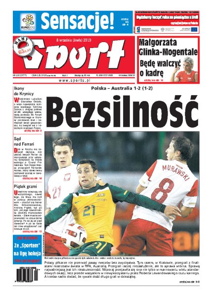 Polscy piłkarze przegrali z Australia 1:2 i nie udało im się przełamać pechowej passy meczów bez zwycięstwa; by wyjść na swoje, włodarze Ruchu Chorzów muszą sami wychować sobie dobrych zawodników; Włodzimierz Lubański będzie namawiał wielkie firmy do inwestowania w Górnik Zabrze; faworyzowany polsko-austriacki debel żegna się z udziałem w US Open; wywiad z Justyną Kowalczyk.