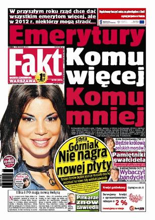 W przyszłym roku rząd chce podwyższyć świadczenia dla emerytów, ale już w 2012 roku wiele osób może na tym stracić; Edyta Górniak nie nagra w najbliższym czasie nowej płyty; czy Anna Komorowska zostanie okrzyknięta królową polskich morsów; Andrzej Gołota wybaczył bandycie i obiecał, że nie będzie się mścił; polscy piłkarze pod wodzą Franciszka Smudy znów zawiedli swoich fanów.