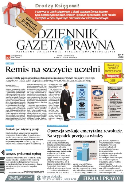 Uniwersytety Warszawski i Jagielloński ex aequo na pierwszym miejscu w rankingu Perspektyw, wśród szkół niepublicznych wygrywa Akademia Leona Koźmińskiego; portale pod większą presją; opozycja szykuje emerytalną rewolucję, na wypadek przejęcia władzy; wszyscy prokurenci zapłacą – będzie tak od 1 stycznia 2016 r., jeżeli nie złożą na czas wniosku o upadłość spółki osobowej bądź kapitałowej.