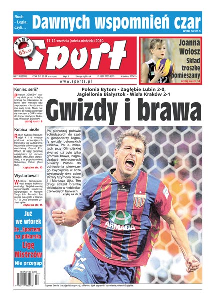 Polonia Bytom odniosła pierwsze zwycięstwo w tegorocznych rozgrywkach ekstraklasy; kibice w Białymstoku obejrzeli historyczny, zwycięski mecz Jagiellonii z Wisłą Kraków; czy Odra Wodzisław przełamie niemoc w spotkaniu z Ruchem Radzionków; Podbeskidzie Bielsko-Biała jedzie do Ostrowca na mecz z KSZO; w Milanie zadebiutują dziś Zlatan Ibrahimović i Robinio, a Juventus mobilizuje się na Sampdorię i Lecha; Hiszpan Rafael Nadal pewnie zmierza po swój pierwszy w karierze tytuł w wielkoszlemowym turnieju w Nowym Jorku; Kubica we Włoszech nadal z kanałem F.