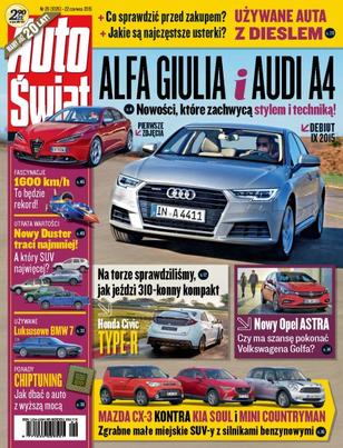 Aktualności: Audi A4 i Alfa Romeo Giulia, Honda Civic Type-R, Opel Astra; testy: Kia Soul, Mazda CX-3 i Mini Countryman, Toyota Prius+, Skoda Fabia, trzy odmiany Citroena C4; porady: kupujemy używanego diesla, przyszłość motoryzacji; chiptuning; z drugiej ręki: BMW serii 7 (E38 z lat 1994-2001), utrata wartości SUV-ów, silnik 1.8 Ecotec; fascynacje: bicie rekordu prędkości na lądzie.