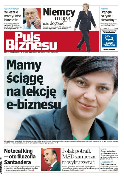 Jeszcze w 2010 roku Niemcy dogonią Polskę pod względem tempa wzrostu gospodarczego, dzięki temu razem zostaniemy liderami UE; zostało już tylko półtora miesiąca na przygotowanie wniosku o dotację na usprawnienie kontaktów B2B; Santander zapowiada spore oszczędności kosztowe w BZ WBK; nawet 100 specjalistów znajdzie pracę w trzecim w świecie centrum zarządzania danymi z badań klinicznych MSD; Poczta Polska ma nowy układ zbiorowy, związki dały zielone światło, a zarząd już liczy oszczędności.
