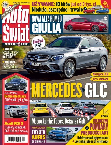 Mercedes GLC – jeździliśmy przedprodukcyjną wersją następcy GLK; VW Sharan – wrażenia z jazd vanem po face liftingu; Toyota Auris – pierwsza jazda zmodernizowanym kompaktem; Bentley Bentayga – wielki SUV dla najbogatszych; Ford Focus, Skoda Octavia i VW Golf – porównanie kompaktowych kombi; Fiat Doblò – praktyczny wielozadaniowiec z dieslem 2.0; Audi RS 3 – supermocny (367 KM) sportowy kompakt z napędem quattro; Toyota Avensis – odnowiony model klasy średniej w wariancie kombi.