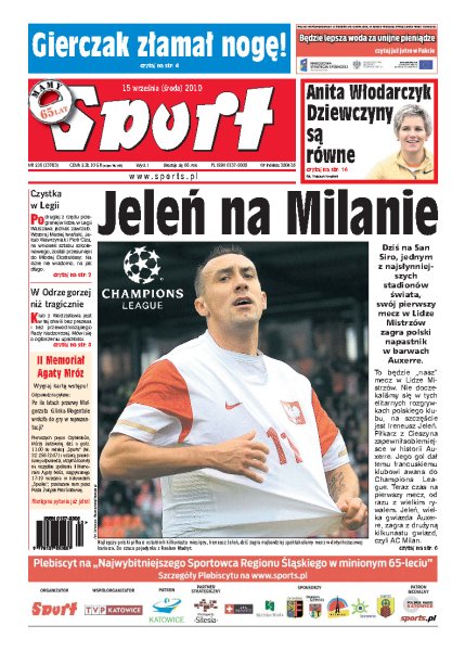 Polski napastnik Ireneusz Jeleń już dziś na jednym z najlepszych stadionów świata rozegra swój pierwszy mecz w Lidze Mistrzów; po drugiej z rzędu przegranej w lidze w warszawskiej Legii mocno zawrzało; Manchester United rozczarował swoich fanów i zaledwie zremisował z Glasgow Rangers 0:0; sensacja w finale gry pojedynczej mężczyzn podczas tegorocznego US Open; odżyły pogłoski o powrocie do Formuły 1 byłego mistrza świata Kimiego Raikkonena.