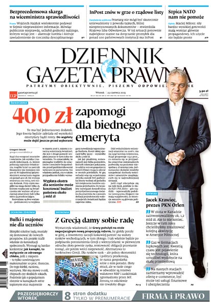 400 zł zapomogi dla biednego emeryta: to ma być jednorazowy dodatek, jego kwota będzie zależała od wysokości emerytury bądź renty, a do wypłaty może dojść jeszcze przed wyborami; bezprecedensową skargę na wiceministra sprawiedliwości składa Iustitia; InPost znów w grze o rządowe listy; szpica NATO nam nie pomoże; sklepiki szkolne będą musiały się dostosować do nowych przepisów, ich projekt trafił właśnie do konsultacji społecznych; wystarczyła wiadomość, że Grecy położyli na stole negocjacyjnym nową propozycję reform, by giełdy poszły w górę, a inwestorzy zaczęli łaskawiej patrzeć na waluty rynków wschodzących, w tym złotego; rozmowa z Jackiem Krawcem, prezesem PKN Orlen.