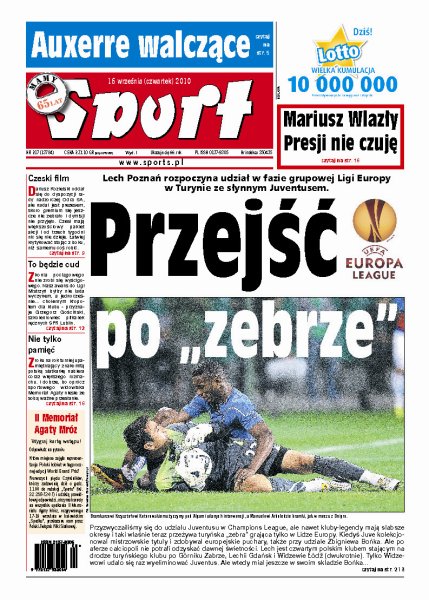 Lech Poznań rozpoczyna udział w fazie grupowej Ligi Europejskiej od meczu w Turynie ze słynnym Juventusem; Sławomir Peszko zagra przeciwko drużynie, której kibicuje od dziecka; Ireneusz Jeleń rozegrał swoje pierwsze spotkanie w Lidze Mistrzów, ale jego drużyna przegrała z Milanem 0:2; czy Ruch Chorzów zakończy złą passę i zdobędzie w końcu punkt na wyjeździe; chyba nic na nadchodzących mistrzostwach świata nie przydałoby się bardziej polskiej reprezentacji siatkarzy, niż dobra forma Mariusza Wlazłego.