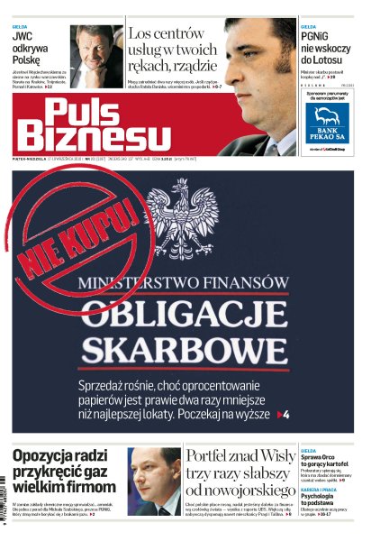 Obligacje skarbowe gorsze od bankowych lokat; mimo rosnących wynagrodzeń, Polacy nadal są biednym narodem; przyszłość centrów usług w Polsce w rękach rządu; gracze z GPW nie martwią się wygasaniem kontraktów; PGNiG nie zostanie inwestorem w Lotosie.
