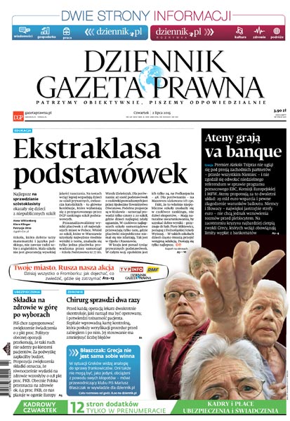 Ekstraklasa podstawówek: najlepsze na sprawdzianie szóstoklasisty okazały się dzieci z niepublicznych szkół; PiS chce zaproponować zwiększenie składki zdrowotnej o 2 pkt procentowe; przed każdą operacją lekarz dwukrotnie skontroluje, jaki narząd ma być operowany, i potwierdzi tożsamość pacjenta; Ateny grają va banque: premier Aleksis Tsipras nie ugiął się pod presją zachodnich partnerów – przede wszystkim Niemiec – i nie zgodził się odwołać niedzielnego referendum w sprawie programu pomocowego EBC, Komisji Europejskiej i MFW.
