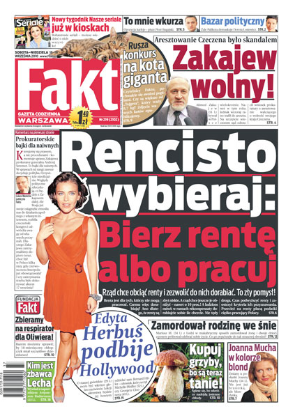 Sąd odrzucił wniosek prokuratury o aresztowanie Ahmeda Zakajewa; rząd chce obciąć renty i zezwolić do nich dorabiać; agent Tomek idzie na emeryturę; informatyk z Warszawy i jego pracownicy nabrali 40 tys. użytkowników Naszej Klasy; wstrząsające zabójstwo w Łodzi; Edyta Herbuś jedzie do Hollywood.