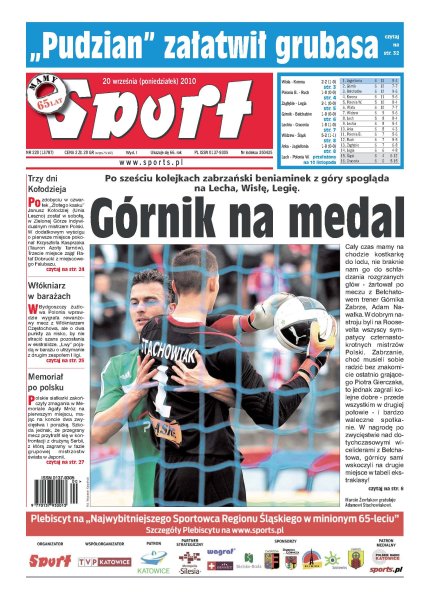 Po sześciu kolejkach zabrzański beniaminek z góry spogląda na Lecha, Wisłę i Legię; po zdobyciu w czwartek „Złotego kasku” Janusz Kołodziej został w sobotę w Zielonej Górze indywidualnym mistrzem Polski; Rafał Ulatowski nadal jest trenerem Cracovii; polskie siatkarki zakończyły zmagania w Memoriale Agaty Mróz na pierwszym miejscu, mając na koncie dwa zwycięstwa i porażkę; Barcelona dzięki znakomitemu Messiemu pokonała Atletico w Madrycie, ale Argentyńczyk okupił sukces kontuzją; piąte zwycięstwo Włocha w Wyścigu Dookoła Hiszpanii; w Łodzi ponad 14 tysięcy widzów w Atlas Arenie obejrzało „dzień sądu”.