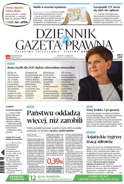 Od 2009 r. polski rynek meblowy skurczył się o 25 proc. – z 6,4 do 4,8 mld zł; europejski CIT może się nam nie opłacać; Beata Szydło dla DGP: Będzie referendum emerytalne; gdyby podatek bankowy wszedł w życie, BOŚ musiałby przekazać do budżetu 125 proc. swoich zysków; azjatyckie tygrysy tracą zdrowie; dzięki ZUS mniej młodych emerytów; prezes UOKiK będzie mógł żądać udostępnienia informacji objętych tajemnicą bankową.