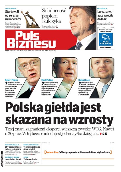Związkowcy Enei chcą trafić pod skrzydła miliardera; dilerzy aut zacierają ręce, ponieważ popyt na drogie wozy znów rośnie; trzej znani zagraniczni eksperci wieszczą zwyżkę WIG nawet o 20 proc.; majątek LOT Aircraft Maintenance Services jest wart setki milionów złotych; samorząd stolicy Wielkopolski wdraża projekt, którym zainteresowała się giełdowa Mennica; linie lotnicze zarobią w tym roku 9 mld dolarów; czy Gazelą Biznesu może zostać każdy większy warzywniak; telekomy będą inwestować w infrastrukturę; najpóźniej na początku przyszłego roku przez chiński rynek akcji i nieruchomości powinna przelać się kolejna fala hossy.