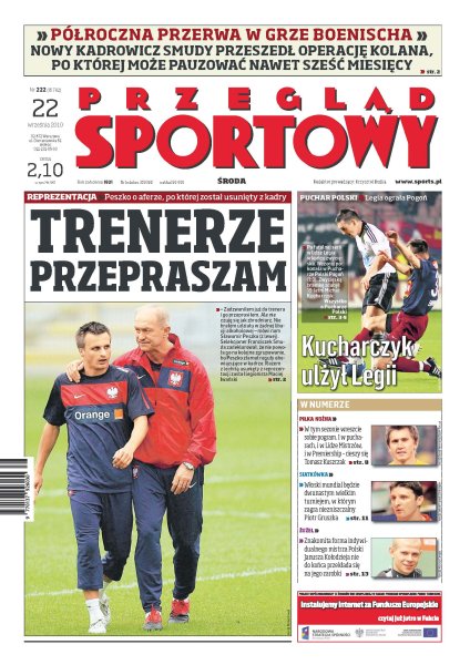 Franciszek Smuda wyrzucił z reprezentacji Sławomira Peszkę i Macieja Iwańskiego; pierwsze zwycięstwo drużyny Macieja Skorży od miesiąca; Robert Maaskant przyznał, że nie jest usatysfakcjonowany postawą swojej drużyny; mistrzowie Polski mogą zagrać w osłabieniu przeciw Legii, bo doświadczonego obrońcę poniosły nerwy; nieoczekiwanie najlepszą defensywę w Europie ma włoski beniaminek; Piotr Gruszka jedzie na swoje czwarte mistrzostwa świata; Małgorzata Glinka w świetnym stylu wróciła do kadry; rozmowa z Jasonem Robinsonem, rywalem Krzysztofa Włodarczyka w walce o pas federacji WBC.