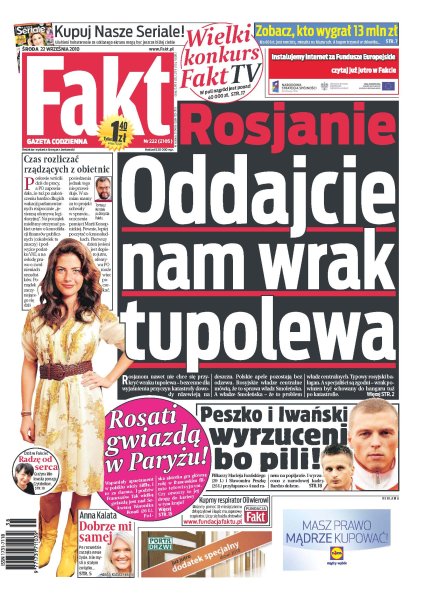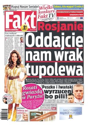 Wrak prezydenckiego samolotu, który rozbił się 10 kwietnia pod Smoleńskiem, niszczeje od deszczu i wiatru; majątek Hanny Gronkiewicz–Waltz jest wart niemal pięć milionów zł; była minister pracy cieszy się, że ma dużo czasu dla siebie; posłowie PSL chcą, by mieszkańcy wsi mogli przechodzić na wcześniejsze emerytury; Jan Kliment chce robić interes na szkole tańca; Weronika Rosati gra główną rolę we francuskim filmie; Katarzyna Grochola chce jak najlepiej wczuć się we włoski klimat i dlatego za tydzień leci na Sycylię; Iwański i Peszko dwa tygodnie temu po meczu towarzyskim Polski z Australią zostali przyłapani o czwartej nad ranem na imprezowaniu w hotelu w Krakowie.