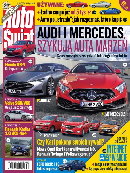 Audi A7 i Mercedes CLS – nowe, piękne i luksusowe auta marzeń; Volvo S60/V60 Cross Country – jak jeżdżą uterenowione auta ze Szwecji; Honda HR-V – nowy kompaktowy SUV z Japonii; Mercedesy GLE i GLE coupé – jeździliśmy SUV-ami, które zastąpiły ML-a; nowy Opel Karl kontra Hyundai i10, Renault Twingo i VW up; Renault Kadjar – pierwszy test wersji 1.6 dCi; groźne awarie panewek – lepiej wymienić zawczasu