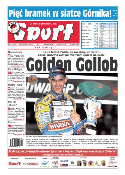 Po 37 latach Polak, po raz drugi w historii, został indywidualnym mistrzem świata na żużlu; tylko piłkarze Podbeskidzia i Piasta pozostają niepokonani w I lidze; Krzysztof „Diablo” Włodarczyk wygrał na punkty z amerykańskim bokserem Jasonem Robinsonem i obronił tytuł federacji WBC w wadze junior ciężkiej; w inauguracyjnym spotkaniu Ligi Mistrzów piłkarze ręczni Vive Targów Kielce przegrali ze słoweńskim Celje Pivovarna Lasko 30:36; dwa lata po kontrowersyjnym zwycięstwie w pierwszej edycji wyścigu na Marina Bay Circuit, Fernando Alonso ponownie triumfował w Singapurze; po piątkowym złocie Adriana Zielińskiego, wczoraj swój trzeci tytuł mistrza świata w podnoszeniu ciężarów wywalczył Marcin Dołęga.