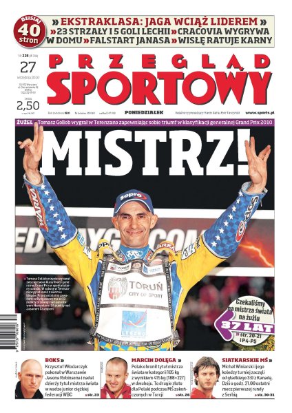Tomasz Gollob wygrał w Terenzano zapewniając sobie triumf w klasyfikacji generalnej Grand Prix 2010; Krzysztof Włodarczyk pokonał w Warszawie Jasona Robinsona i nadal dzierży tytuł mistrza świata w wadze junior ciężkiej federacji WBC; na otwarcie nowego stadionu Cracovia przerwała złą passę i zdobyła pierwsze punkty w lidze; pierwsza porażka Chelsea w sezonie – punkty gubią też Arsenal i Manchester United; Marcin Dołęga obronił tytuł mistrza świata w kategorii 105 kg w podnoszeniu ciężarów; polscy siatkarze wygrali z Kanadą i Niemcami w biało-czerwonej hali w Trieście; w fascynującym Grand Prix Singapuru Robert Kubica odegrał rolę drugoplanową, ale kilkakrotnie jego jazdę w biurze prasowym nagradzano gromkimi brawami.