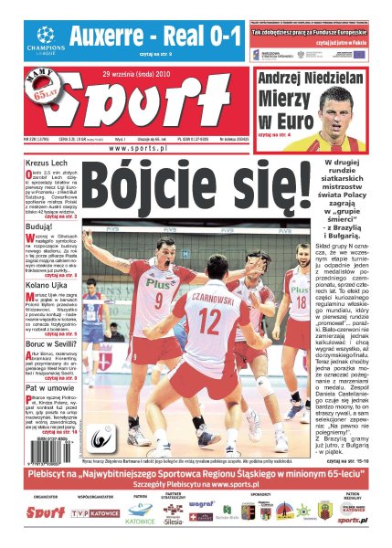 W drugiej rundzie siatkarskich mistrzostw świata Polacy zagrają w „grupie śmierci” z Brazylią i Bułgarią; około 2,5 mln złotych zarobił Lech Poznań dzięki sprzedaży biletów na pierwszy mecz Ligi Europy z Red Bull Salzburg; stolica Dolnego Śląska to jedno z ulubionych miast Oresta Lenczyka; zgodnie z obietnicą Sir Alexa Fergusona, Tomasz Kuszczak stanie dziś w bramce „Czerwonych diabłów”; Albert Sosnowski został oficjalnym pretendentem do tytułu mistrza Europy w wadze ciężkiej; Michał Jurecki i Vive Targi Kielce zaliczyli falstart w Lidze Mistrzów.