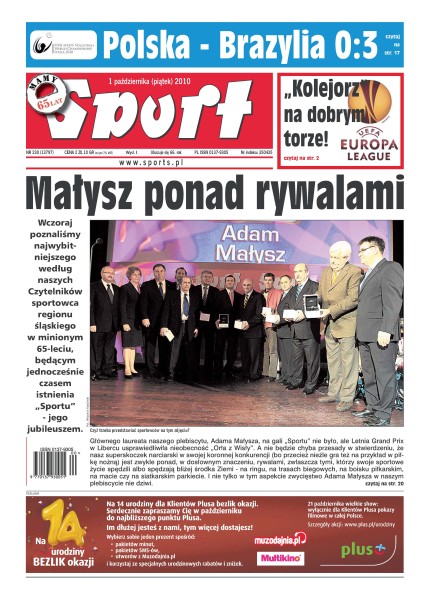Wczoraj poznaliśmy najwybitniejszego według czytelników „Sportu” sportowca regionu śląskiego w minionym 65–leciu; Manuel Arboleda odczarował stadion przy Bułgarskiej, zdobywając dla Lecha pierwszego gola w tej edycji europejskich pucharów na własnym boisku; region kujawsko–pomorski stał się nową stolicą polskich ciężarów; Agnieszka Radwańska, grając w Tokio z kontuzją, dwa razy zwyciężyła – trzeci raz to już byłoby za wiele; Grzegorz Szymański uważa, że dzień przerwy w grze może Bułgarom bardziej zaszkodzić niż pomóc; Brazylijczycy, obrońcy tytułu mistrzowskiego, nie mieli żadnych problemów z pokonaniem biało–czerwonych.